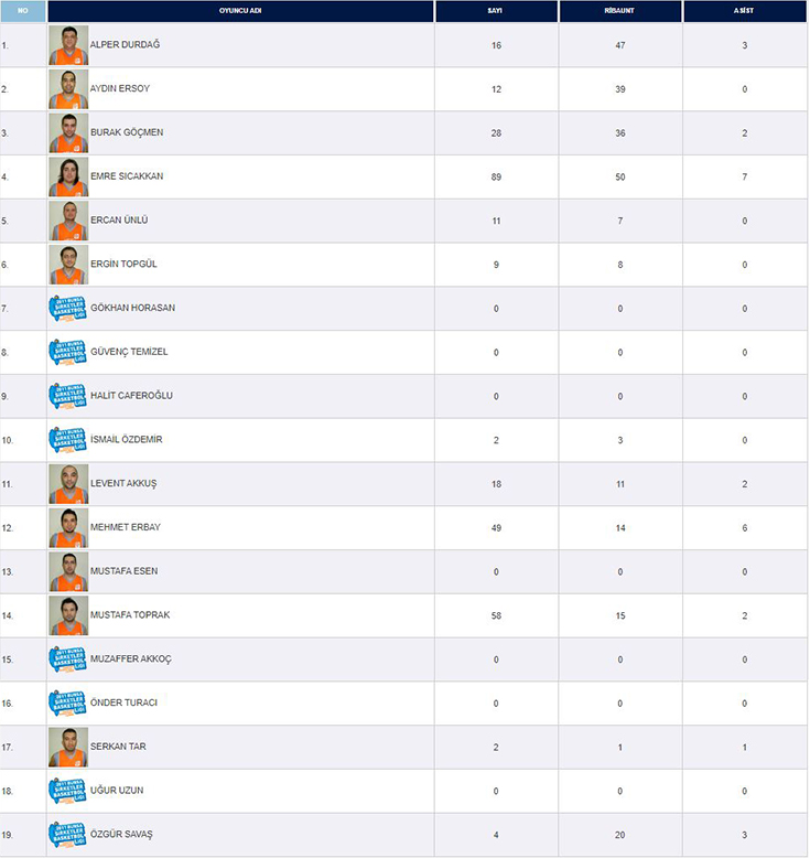 | N | Foto | Oyuncu Adı | Süre | 3 Sayı | 2 Sayı | Serbest Atış | Ribaunt | A | TK | TÇ | B | F | S | MVP | |||||||||