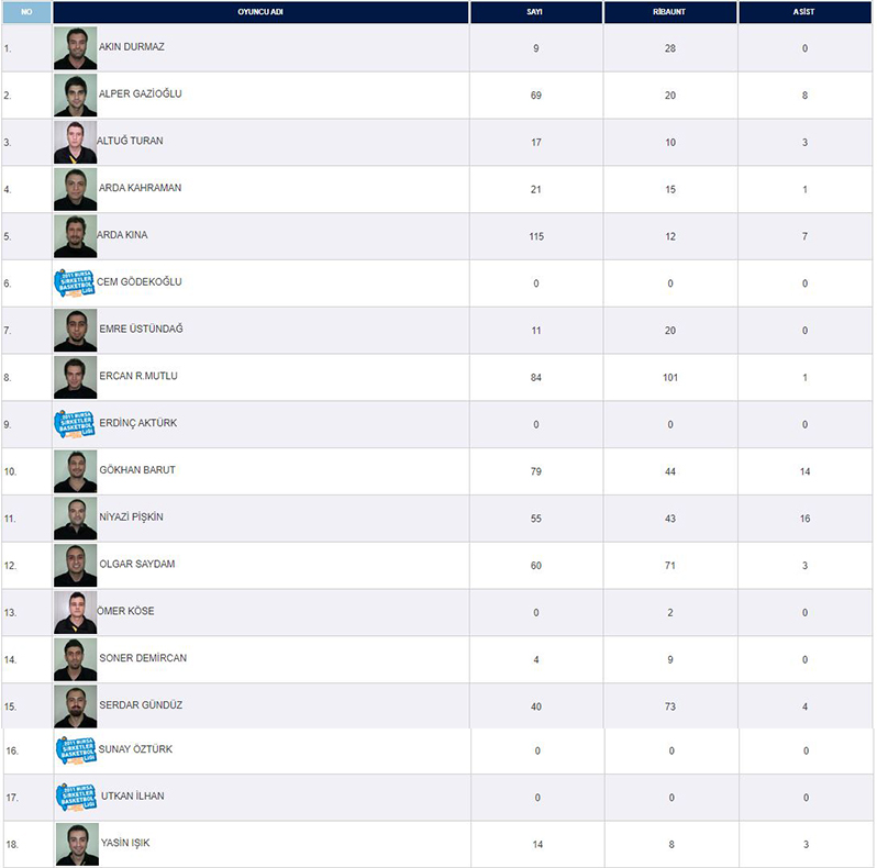 | N | Foto | Oyuncu Adı | Süre | 3 Sayı | 2 Sayı | Serbest Atış | Ribaunt | A | TK | TÇ | B | F | S | MVP | |||||||||