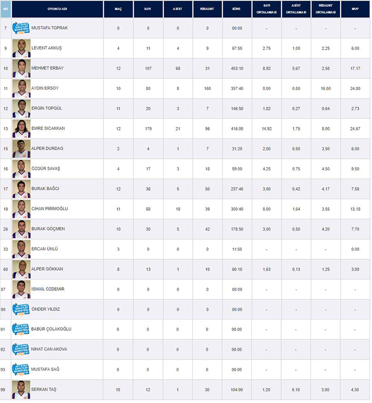 | N | Foto | Oyuncu Adı | Süre | 3 Sayı | 2 Sayı | Serbest Atış | Ribaunt | A | TK | TÇ | B | F | S | MVP | |||||||||