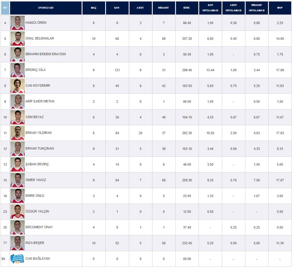 | N | Foto | Oyuncu Adı | Süre | 3 Sayı | 2 Sayı | Serbest Atış | Ribaunt | A | TK | TÇ | B | F | S | MVP | |||||||||