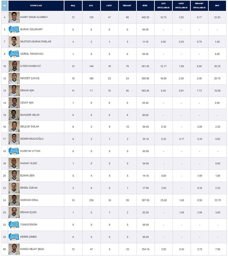 | N | Foto | Oyuncu Adı | Süre | 3 Sayı | 2 Sayı | Serbest Atış | Ribaunt | A | TK | TÇ | B | F | S | MVP | |||||||||