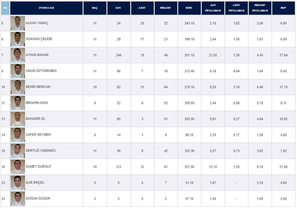 | N | Foto | Oyuncu Adı | Süre | 3 Sayı | 2 Sayı | Serbest Atış | Ribaunt | A | TK | TÇ | B | F | S | MVP | |||||||||