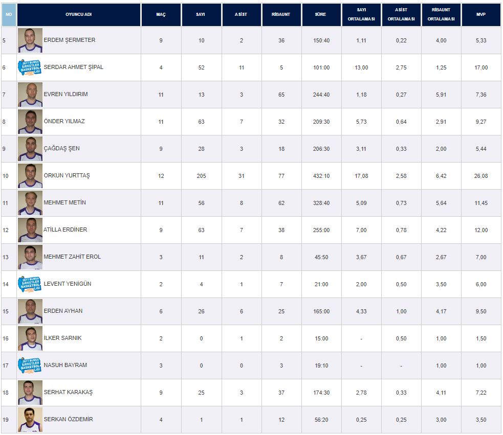 | N | Foto | Oyuncu Adı | Süre | 3 Sayı | 2 Sayı | Serbest Atış | Ribaunt | A | TK | TÇ | B | F | S | MVP | |||||||||