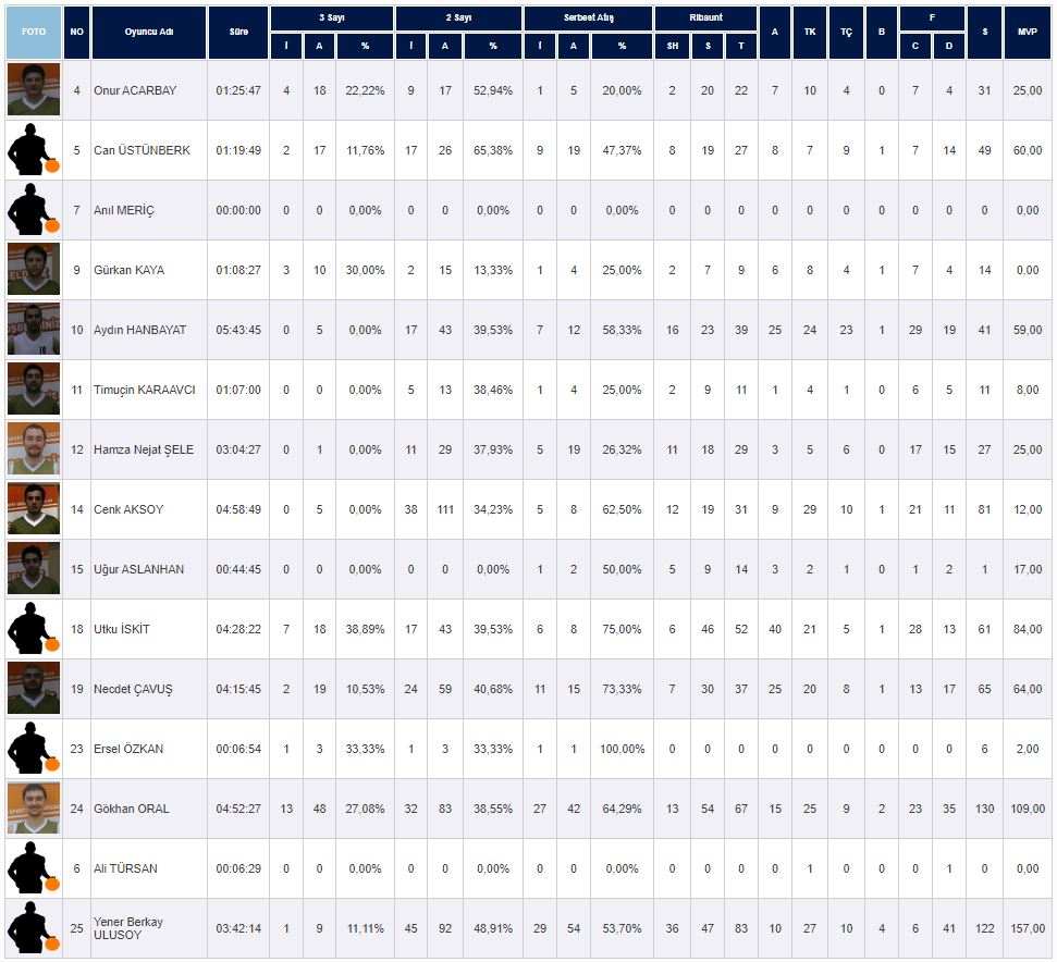 | N | Foto | Oyuncu Adı | Süre | 3 Sayı | 2 Sayı | Serbest Atış | Ribaunt | A | TK | TÇ | B | F | S | MVP | |||||||||