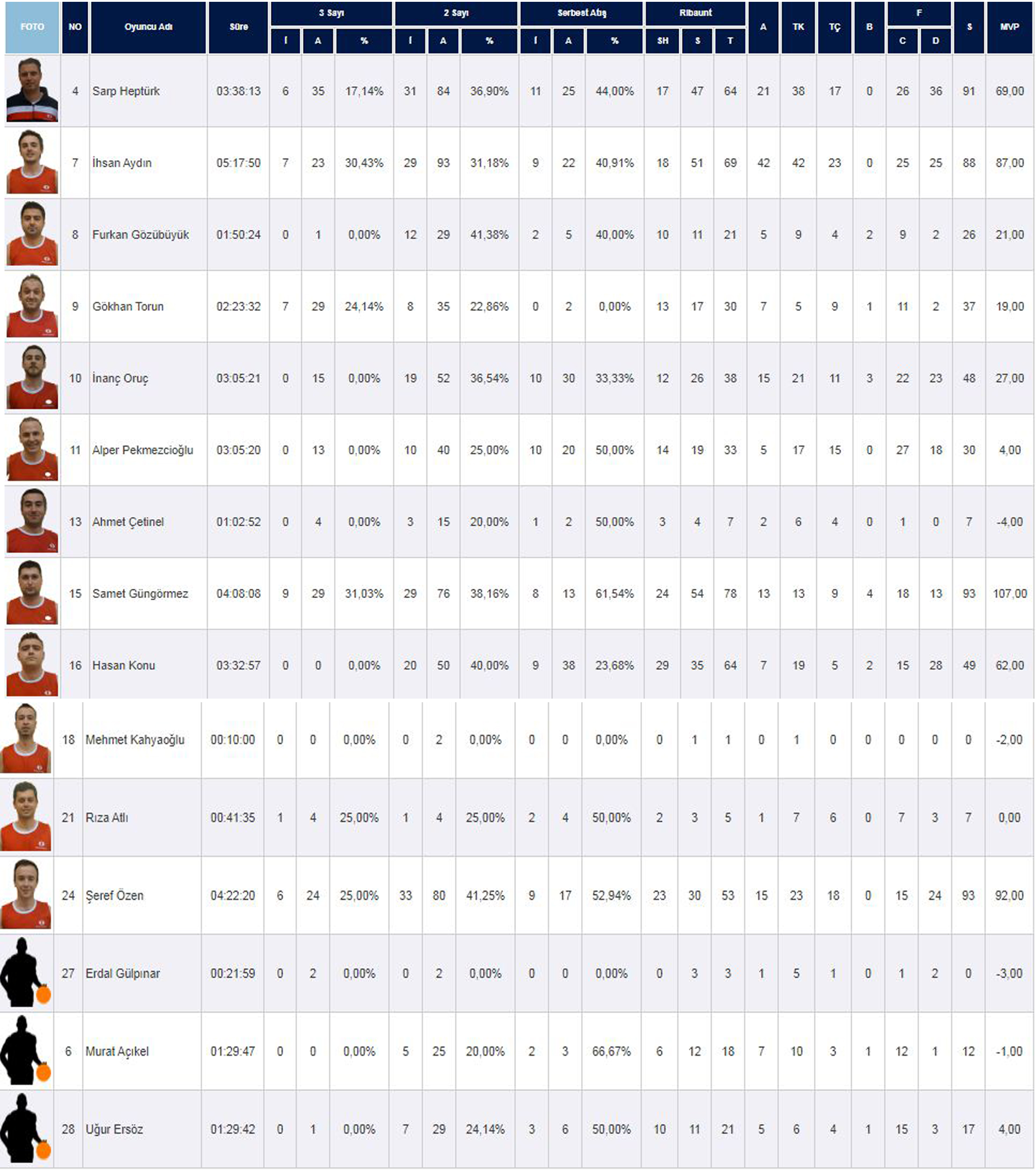 | N | Foto | Oyuncu Adı | Süre | 3 Sayı | 2 Sayı | Serbest Atış | Ribaunt | A | TK | TÇ | B | F | S | MVP | |||||||||