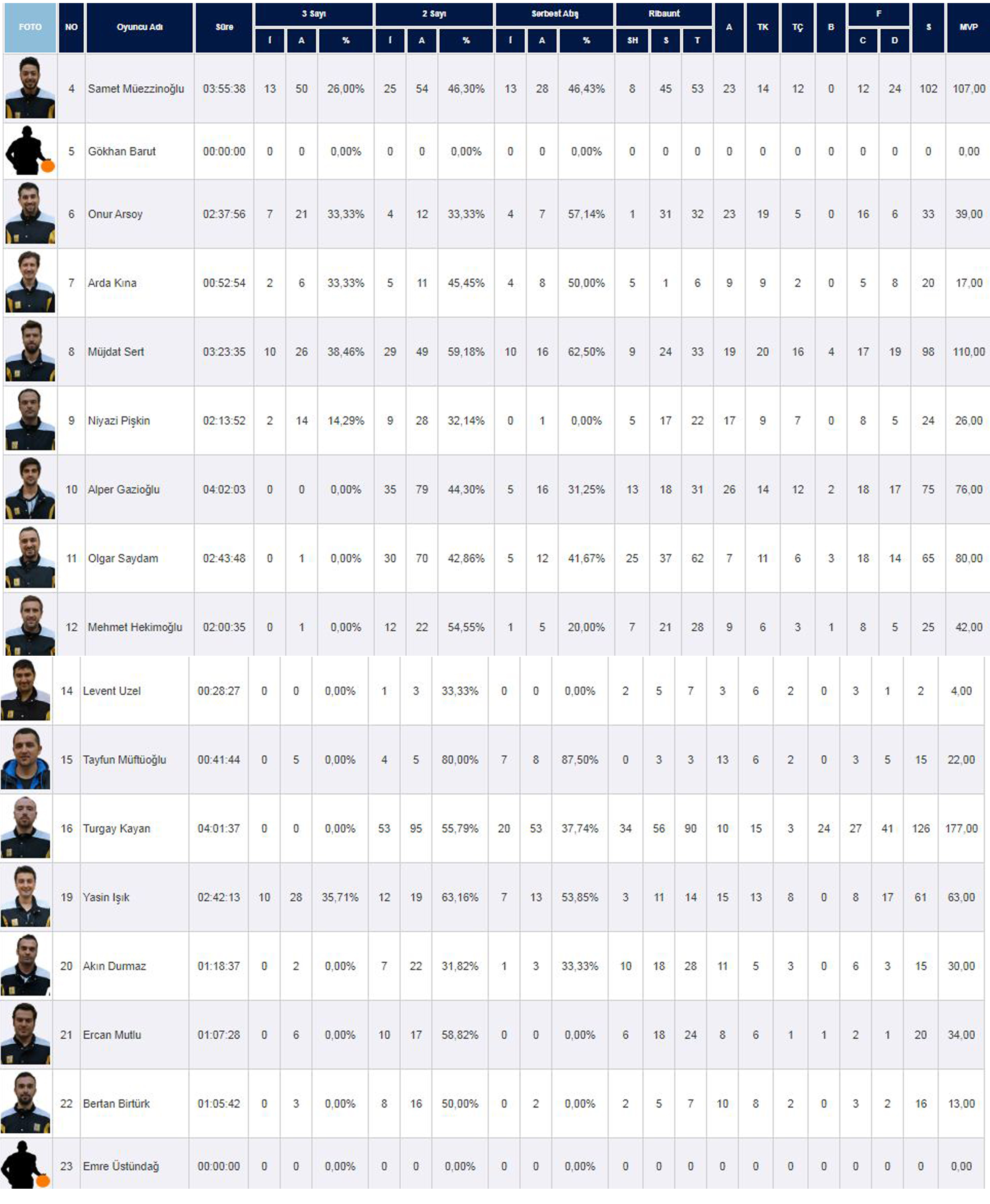 | N | Foto | Oyuncu Adı | Süre | 3 Sayı | 2 Sayı | Serbest Atış | Ribaunt | A | TK | TÇ | B | F | S | MVP | |||||||||