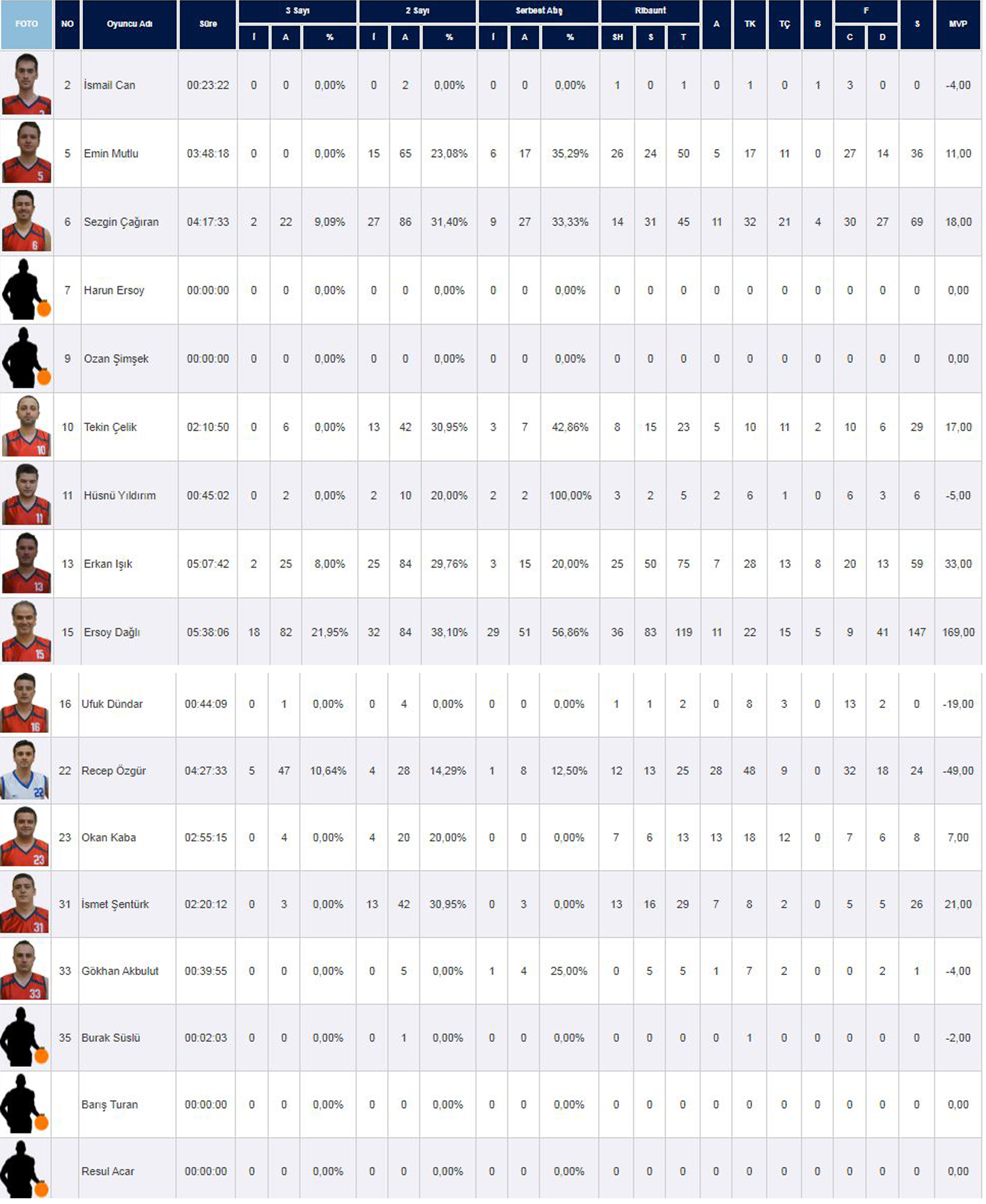 | N | Foto | Oyuncu Adı | Süre | 3 Sayı | 2 Sayı | Serbest Atış | Ribaunt | A | TK | TÇ | B | F | S | MVP | |||||||||