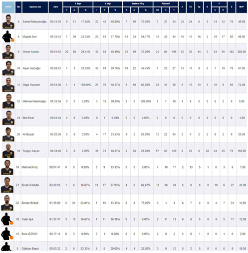 | N | Foto | Oyuncu Adı | Süre | 3 Sayı | 2 Sayı | Serbest Atış | Ribaunt | A | TK | TÇ | B | F | S | MVP | |||||||||