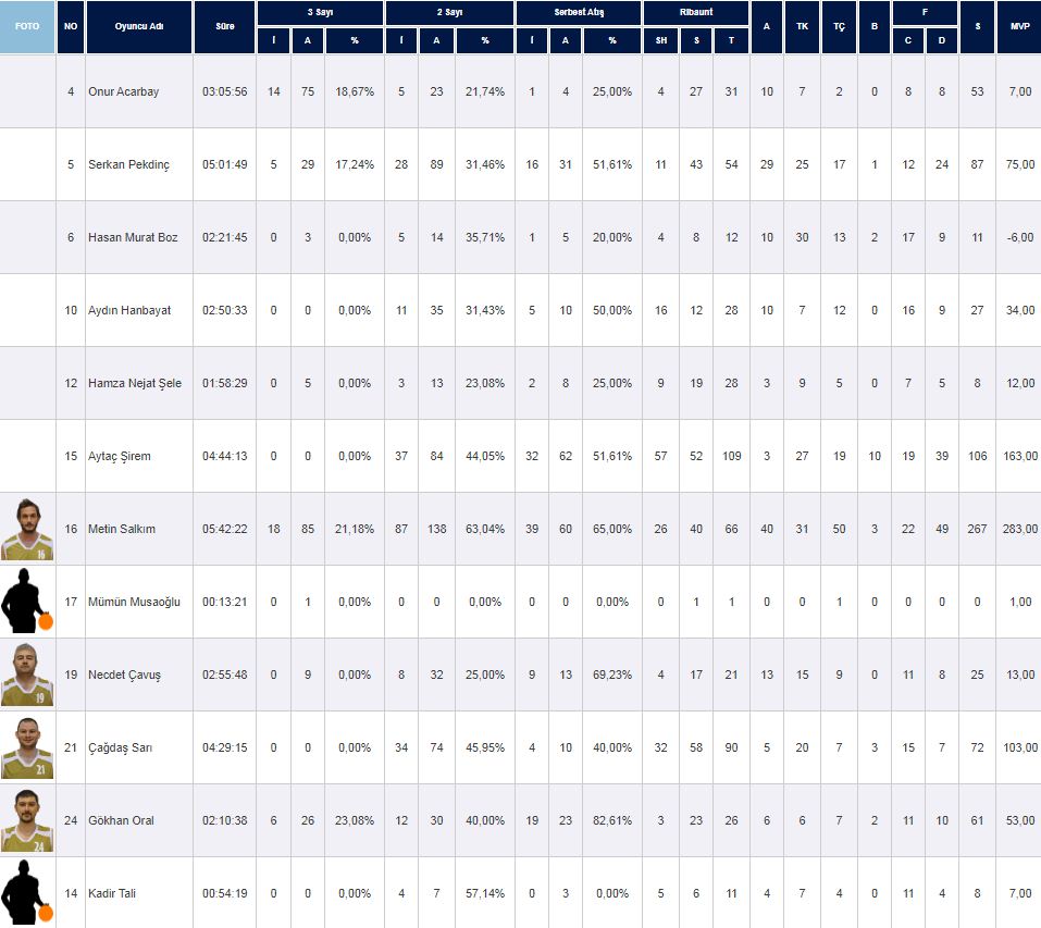 | N | Foto | Oyuncu Adı | Süre | 3 Sayı | 2 Sayı | Serbest Atış | Ribaunt | A | TK | TÇ | B | F | S | MVP | |||||||||